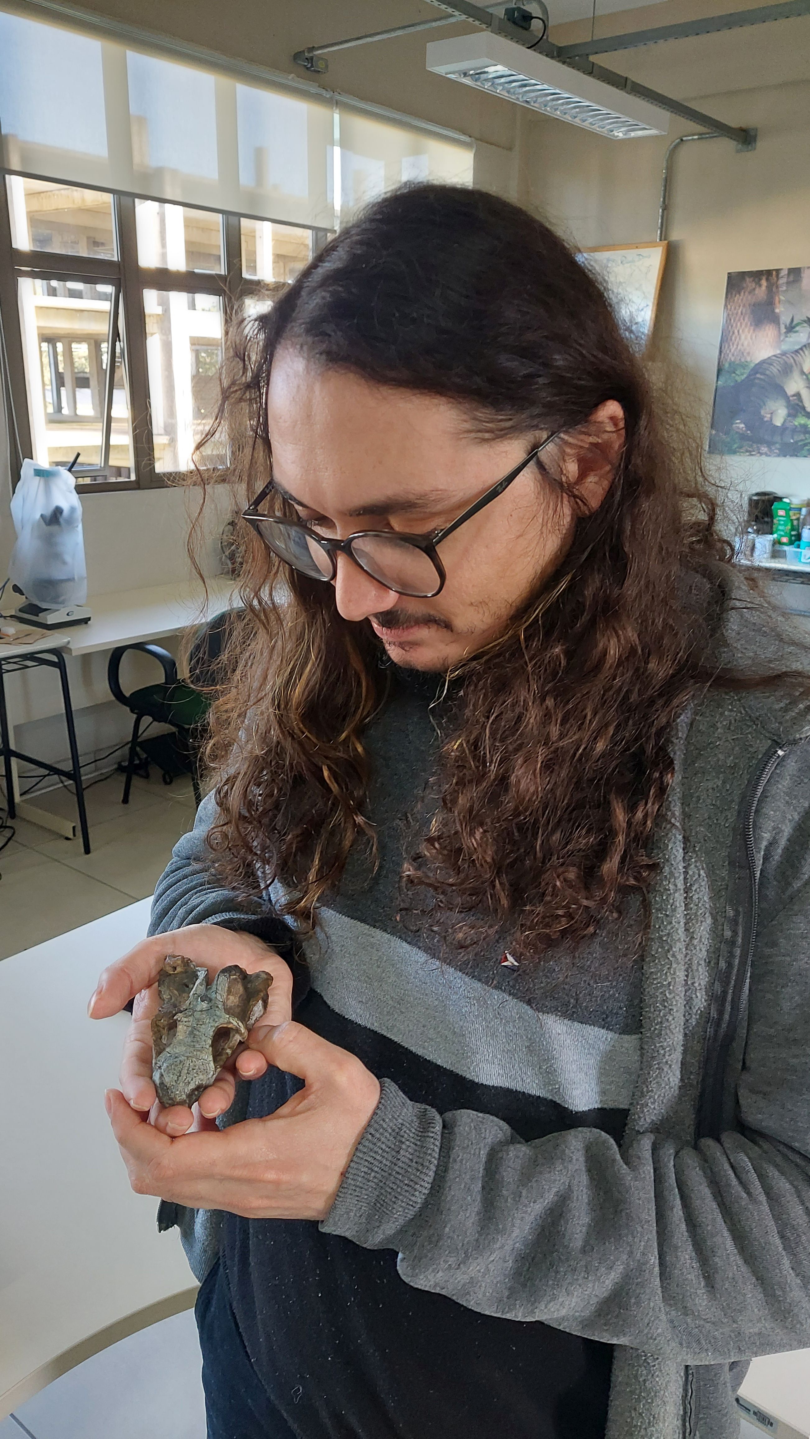 Na zdjęciu Joao Lucas da Silva ze skamieliną szczęki Rastodon procurvidens. Źródło: mat. prasowe