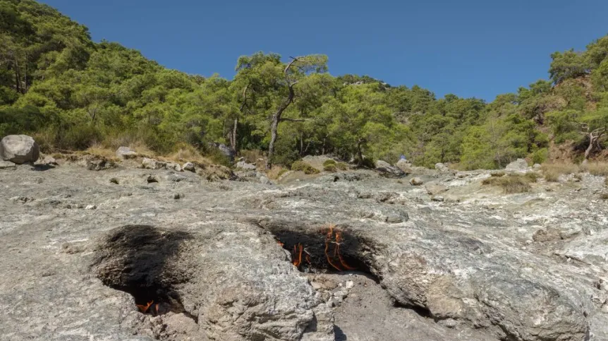 Miejsce zwane Chimera lub Yanartas (z tureckiego „płonący kamień”) znane jest już od co najmniej 2500 lat. Gaz wydobywa się ze zbocza góry podsycając dziesiątki płomieni, których wysokość sięga około pół metra, ale zmienia się w zależności od pory roku i ciśnienia atmosferycznego. Być może te właśnie płomienie zainspirowały twórców greckiego mitu o Chimerze - potworze zionącym ogniem.